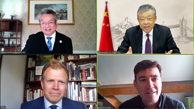 2020年9月24日,驻英国大使刘晓明与英国大曼彻斯特市市长伯纳姆视频通话。驻曼彻斯特总领事郑曦原、大曼彻斯特英中协会执行总监申瑞参加。