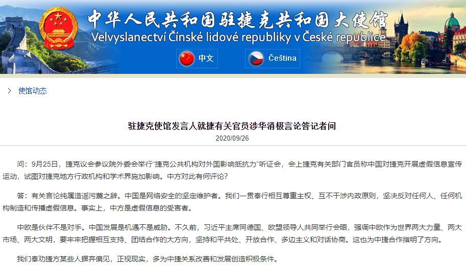 9月26日,记者问,9月25日,捷克议会参议院外委会举行“捷克公共机构对外国影响抵抗力”听证会,会上捷克有关部门官员称中国对捷克开展虚假信息宣传运动,试图对捷克地方行政机构和学术界施加影响。中方对此有何评论?