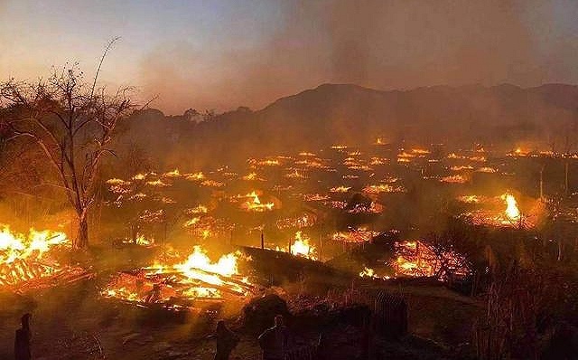 现场村民说:“基本上都已经烧完了,整村105栋房屋烧到只剩下位于村边的4栋了。”