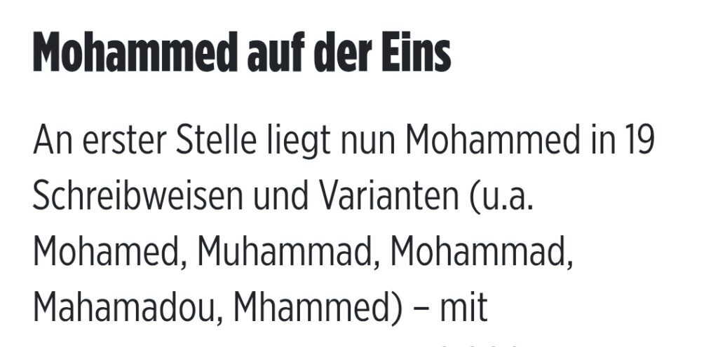 在德国领取社会救济金,最常见的名字穆罕默德 (Mohammed) ,19种拼写,包括 Mohamed、Muhammad、Mohammad、Mahamadou 和 Mhammed中的排名第一,其次是Michael(或Michel、Mischa、Maik)紧随其后是Ahmad。